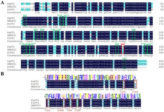 Sequence alignment of FgPT1, FoPT1, and DMATS1 from Fusarium. (A) Active sites in the docking model of FgPT1 with DMAPP, naringenin, and Ba2+ (Green frames represent conservative amino acids; Red frames represent non-conservative amino acids). (B) Two conserved gene clusters of DMATS-type prenyltransferase genes. Mutants V116I, T123A, V181I, G190D, V194I, and Y198F are boxed in red.