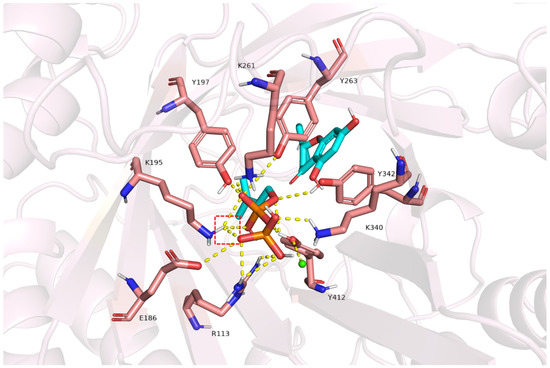 The A325V mutant exhibited reduced catalytic activity (2.9–51.5% decline across substrates 1–6 vs. wild type), likely due to steric hindrance from its bulkier hydrophobic side chain. Molecular docking revealed that the additional methyl groups at position 325 increased the F326-naringenin distance from 2.7 Å to 3.3 Å (Figure S25), weakening hydrogen bonding and mispositioning the substrate [44,45]. Mutants T123A, G190D, and V181I showed negligible activity changes, whereas V116I displayed significantly enhanced catalysis—notably a threefold increase in kcat/KM for naringenin. Research by Köllner et al. and Bertsch et al. suggested that amino acids adjacent to the active site played a crucial role in shaping its geometry and modulating catalytic efficiency [46,47]. In this study, the side chain of residue 116 was situated between the β-folding barrel and the α-helix. The mutated isoleucine residue had a longer side chain than the original valine. Structural analysis suggests that the elongated isoleucine side chain at position 116 repositions neighboring A115, improving hydrophobic packing with the DMAPP alkyl chain. Such enhanced substrate-donor interactions align with prior reports that optimized hydrophobic interfaces boost enzymatic affinity and turnover [48]. Surprisingly, the V194I mutant exhibited a significant increase in catalytic activity for six substrates when compared to the wild type, demonstrating an almost nine-fold enhancement in the conversion of naringenin. This observation suggested that the V194I mutation plays a crucial role in substrate binding. Similar to the case of residue 116, residue 194 was situated between the β-folding barrel and the α-helix, where valine was substituted with isoleucine. This substitution results in an elongation of the side chain, which enhances hydrogen bonding interactions between residue K195 and its donor, increasing the number of hydrogen bonds from two to three (Figure 8). Notably, this included interactions between the added hydrogen and the oxygen on the first phosphate of DMAPP. Concurrently, a new hydrogen bond was formed between pyrophosphate and residue Y342. Establishing these new hydrogen bonds between the enzyme and the substrate can significantly enhance catalytic efficiency [49,50,51]. Furthermore, since K195 was also involved in the formation of the dimethylallyl carbon cation, the distance between the side-chain amino group of K195 and the donor pyrophosphate was reduced following the mutation, thereby strengthening the ionic bond between them. This enhancement favored the dissociation of pyrophosphate and the formation of the carbon cation. Therefore, it was hypothesized that the simultaneous enhancement in hydrogen and ionic bonding between the active center and the donor was a key factor contributing to the marked increase in conversion efficiency observed in the V194I mutant.