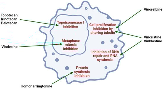 Previous clinical studies have demonstrated the clinical efficacy and safety of many well-known plant alkaloids in oncological therapy. Several alkaloids have been registered by the US Food and Drug Administration (FDA) as pharmaceutical drug substances or chemotherapeutic agents for anticancer treatment (Figure 1, Table 1), including (1) vinblastine and vincristine: these Vinca alkaloids are natural alkaloids from the Madagascar periwinkle (Catharanthus roseus, Apocynaceae) [107,108]; (2) vindesine and vinorelbine: these are semi-synthetic derivatives of vinblastine extracted from C. roseus [107,108]; (3) topotecan, irinotecan, and belotecan: these are semi-synthetic derivatives of camptothecin (a quinoline alkaloid) extracted from the bark of the Chinese tree Camptotheca acuminata [84,109,110,111,112]; (4) homoharringtonine: this alkaloid is from Cephalotaxus fortunei (Taxaceae) [109,110,111,112]. In fact, only irinotecan and vincristine are considered for anti-glioblastoma therapy [111].