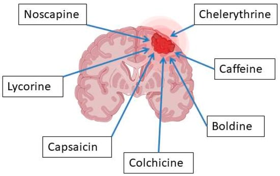 In the same vein, the following chemical groups of alkaloids have been studied in glioblastoma models in vitro and in vivo as single chemical compounds (n = 30): amide alkaloid (piperine = bioperine) [15,16], aporphine alkaloid (boldine) [28], benzophenanthridine alkaloids (chelerythine, dihydrochelerythine, nitidine) [29,30,31,32], beta-carboline alkaloids (harmine, harmaline) [33,34,35], bis-benzylisoquinoline alkaloid (tetrandrine) [36,37,38], glycoalkaloids (solamargine, α-solanine, solasonine) [17,39,40], indolopyridoquinazoline alkaloid (rutaecarpine) [41,42], isoquinoline alkaloid (berberine) [20,43,44,45,46,47,48,49,50], methylxanthine alkaloid (1,3,7-trimethylxanthine, caffeine) [51,52,53,54,55,56,57], non-narcotic opium alkaloid (papaverine) [58,59], oxindole alkaloids (pentacyclic and tetracyclic alkaloids) [60], phthalide-isoquinoline alkaloid (noscapine) [9], protoalkaloid (capsaicin) [61,62,63], pyrrolo-phenanthridine alkaloid (lycorine = narcissine) [64,65,66], quinazolinocarboline alkaloid (evodiamine) [41,67,68,69], quinolizidine alkaloid (oxymatrine) [70,71], spermine alkaloid (kukoamine A) [72], steroidal alkaloids (cyclopamine, cyclovirobuxine D) [73,74], tricyclic alkaloid (colchicine) [22,75,76,77], tropane alkaloid (cocaine) [78,79], and Vinca alkaloids (vinblastine and vincristine) [22,80,81,82].