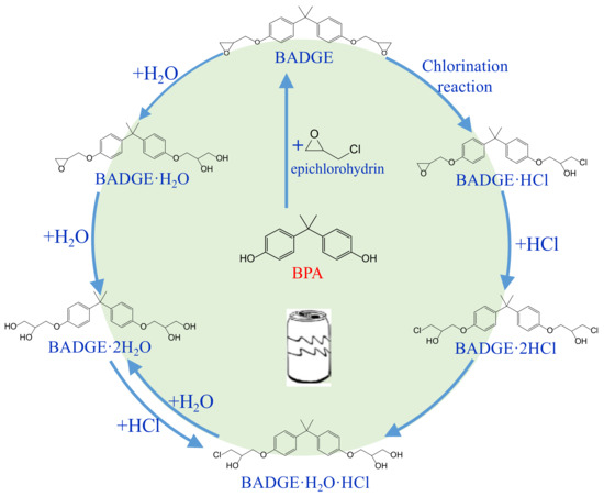 Bisphenol A diglycidyl ether (BADGE) is a synthetic compound generated through a condensation reaction between epichlorohydrin and bisphenol A (BPA). BADGE is widely used as a precursor in the production of a wide range of polymerization products [1]. It is consumed as a starting material for producing epoxy resins as well as an additive for the elimination of surplus hydrochloric acid in polyvinyl chloride (PVC) organosols. These polymerization products are frequently applied as protective linings to prevent corrosion in cans and food containers [2]. During the polymerization process, BADGE in contact with aqueous and acidic foods results in the formation of its hydrolysis derivatives called bisphenol A (2,3-dihydroxypropyl) glycidyl ether (BADGE·H2O) and bisphenol A bis(2,3-dihydroxypropyl) ether (BADGE·2H2O). Furthermore, BADGE can also be transformed into its chlorinated derivative products through the major chlorination reaction, which are called bisphenol A (3-chloro-2-hydroxypropyl) glycidyl ether (BADGE·HCl), bisphenol A bis(3-chloro-2-hydroxypropyl) ether (BADGE·2HCl) and bisphenol A (3-chloro-2-hydroxypropyl)(2,3-dihydroxypropyl ether) (BADGE·H2O·HCl) [3]. The formation procedures of BADGE and its derivative molecules are presented in Figure 1.