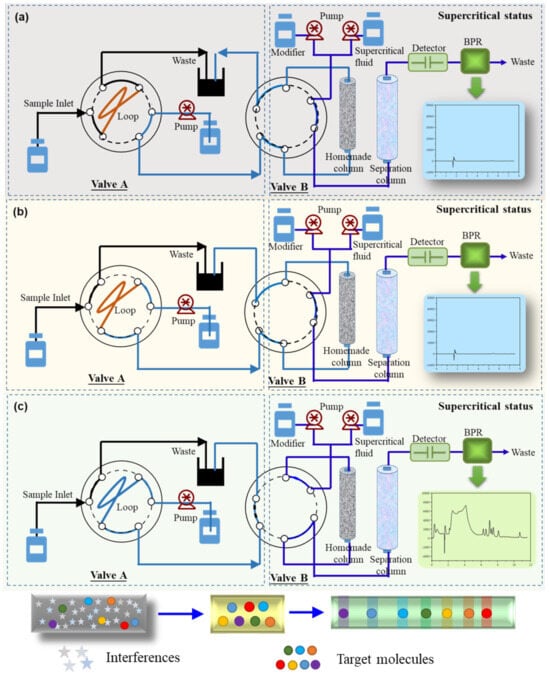 Configuration diagram of the online column switching-SFC system. (a) sample loading as well as system regeneration; (b) target molecule enrichment and matrix elimination; and (c) analysis and detection of BADGEs in supercritical fluid chromatography.