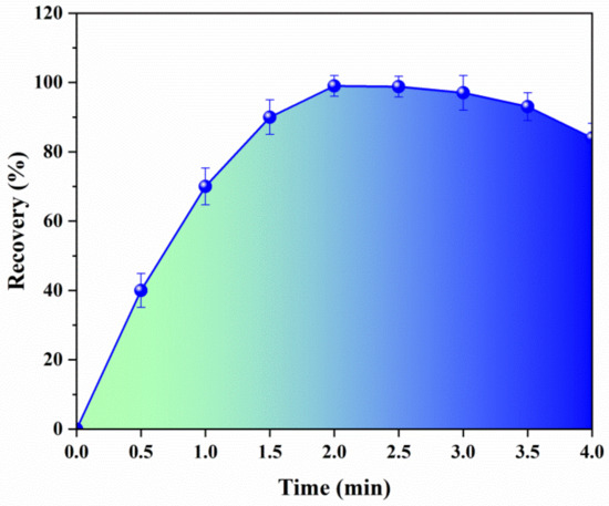 Optimization of the column switching system was conducted. In the column switching protocol, a homemade column according to our previous work [29] was adopted instead of a commercial column to enrich BADGE and its derivatives. The column was packed with poly(GMA-DVB) microspheres functionalized with octadecylamine (20 μm, 4.6 mm × 150 mm) according to the two-staged swelling and polymerization method. For an online preparation procedure, the switching time should be programmed precisely since it determines whether the sample can be fully and selectively washed into the analytical column or not. To achieve the highest extraction yields for BADGE and its derivatives, different switching times were investigated and optimized in this step. Other parameters including the sample volume, eluent solvent for homemade column, and flow rate remained constant. Figure 3 shows the dependence of the extraction yields upon the switching time, ranging from 0 min to 4 min under the mixed eluent solvent of H2O-CH3OH (1:9, v/v). The extraction yields of all BADGEs increased from 0 min to 2 min and reached the maximum at around 2 min. With the switching time of 2 min, the extraction yields of all BADGEs could be sustained at a high level (not less than 90%), and with the lasting switching time, the yields of the BADGEs decreased gradually. Hence, the switching time in the proposed research was finally set at 2 min. Table 2 depicts the detailed operation instructions for the complete procedure.