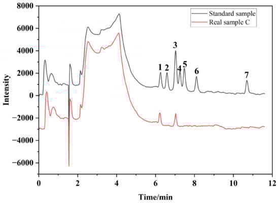 Furthermore, the precision and accuracy of the developed method were also evaluated though spiked recovery testing using spiked blank beverages at three concentration levels (0.05 μg/mL, 0.50 μg/mL, 5.0 μg/mL) containing six parallel experiments (n = 6). The results in Table 4 indicate that the spiked recoveries of all seven compounds ranged from 85.6% to 105.5%, while the RSD of all batches in this testing was below 11.8%.