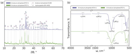 (a) Phase composition of the obtained B-tricalcium phosphate BTCP-1 and BTCP-2 powders with indicated tricalcium phosphate [9-169] and hydroxyapatite [99-4405] phases peaks; (b) IR spectra of the obtained B-tricalcium phosphate BTCP-1 and BTCP-2 powders with indicated characteristic line positions.