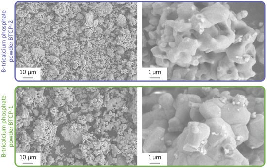 Figure 2 presents the microstructure of the obtained powders. Solid-state synthesis at 1150 °C resulted in 2–10 µm particles composed of several sub-micron agglomerates of initial particles. The grain microstructure of the BTCP-1 powder was more visible, and the grains were larger compared to the BTCP-2 powder microstructure.