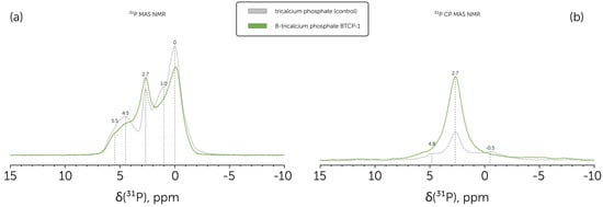 (a) 31P MAS NMR spectra of the B-tricalcium phosphate BTCP-1 powder (green line) in comparison to control pure tricalcium phosphate powder (grey line); (b) 31P CP MAS NMR spectra of the B-tricalcium phosphate BTCP-1 powder (green line) in comparison to control pure tricalcium phosphate powder (grey line).