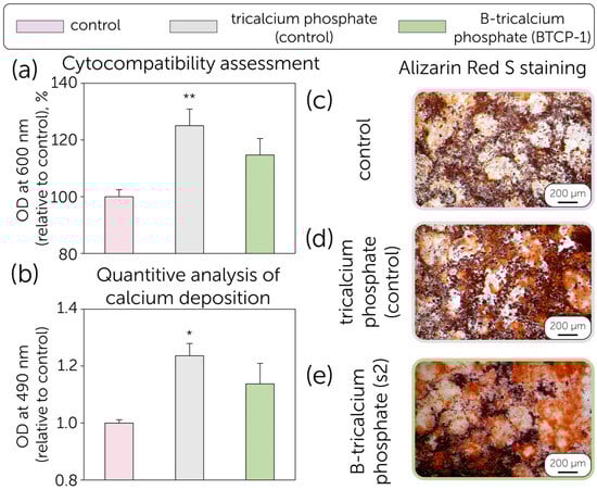 (a) MTT Assay: Growth percentage of MSCs cultured for 24 h in the presence of TCP and B-TCP (BTCP-1) compared to the control (cellular control). The values are derived from three experiments and expressed as mean percentage values ± S.D. The values for the cellular control represent 100% growth; (b) Quantification of Alizarin Red S on MSCs differentiated into the osteogenic lineage in the absence (positive control) and presence of TCP and B-TCP substrates. The values reported are from three independent experiments and expressed as mean percentage values ± S.D. The values for the positive control correspond to 1. p-values (Dunnett test): *, p < 0.05; **, p < 0.01, relative to the positive cell control; MSCs differentiated into the osteogenic lineage after Alizarin Red S staining. (c) Positive control (MSCs with differentiation medium only). (d) MSCs differentiated with differentiation medium and TCP, (e) MSCs differentiated with differentiation medium and B-TCP. The images were obtained using an inverted optical microscope at 10× magnification.