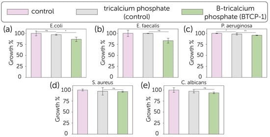 Growth (%, bars) and standard deviation (SD) for (a) E. coli, (b) E. faecalis, (c) P. aeruginosa, (d) S. aureus, and (e) C. albicans cultured in the presence of blank control (pink), pure TCP (grey) and B-TCP (green) (n = 3). The reported values were obtained from three independent experiments and expressed as mean percentage values ± SD, compared to growth in the presence of TCP and blank control, considered as a control set at 100%. The p values (One-way ANOVA test) are given as the following: ns, not significant; *, p < 0.05; **, p < 0.01; compared to positive control.