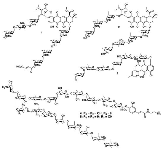 Representative deoxy sugars containing natural products: arugomycin (1), keyicin (2), landomycin A (3), saccharomicin A (4), and saccharomicin B (5).
