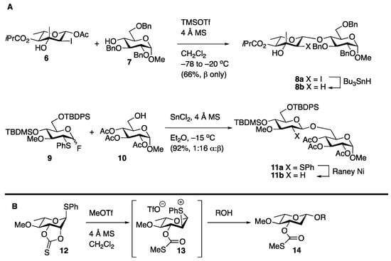 One of the biggest issues facing deoxy sugar construction lies in controlling the stereochemical outcome of the glycosylation reactions used to link these molecules together. This is the result of a number of factors, including the lack of functionality at the C2 position to install directing groups, the intrinsic stereoelectronic preferences for additions to putative oxocarbenium cations, the instability of many activated deoxy sugar donors, and the limited availability of many deoxy sugar monosaccharides [7,8,9,10,11,12,13]. Owing to many of these factors, the construction of β-linked deoxy sugars is particularly challenging, although for certain substrates that possess an axial C3 substituent, the formation of the α-anomer is kinetically disfavored [14]. This has led to an intense interest in the development of β-specific glycosylation with deoxy sugar donors. While many methods have been developed, their reported scope is often limited to a handful of readily available substrates and may or may not prove general to the staggering diversity of deoxy glycans found in nature [1]. Furthermore, many of the more recently developed methods have yet to be tested in oligosaccharide synthesis, and how they will behave in the context of highly sensitive deoxy sugar oligosaccharides is unknown. After a brief historical perspective, this review will focus on methods that have been developed for the construction of β-linked deoxy sugars in the last decade. This will include the use of remote protecting groups, additives, and catalytic activation. Where relevant, the applications of these methods to the synthesis of deoxy sugar oligosaccharides, as well as the scope and limitations of the methods, will be discussed.