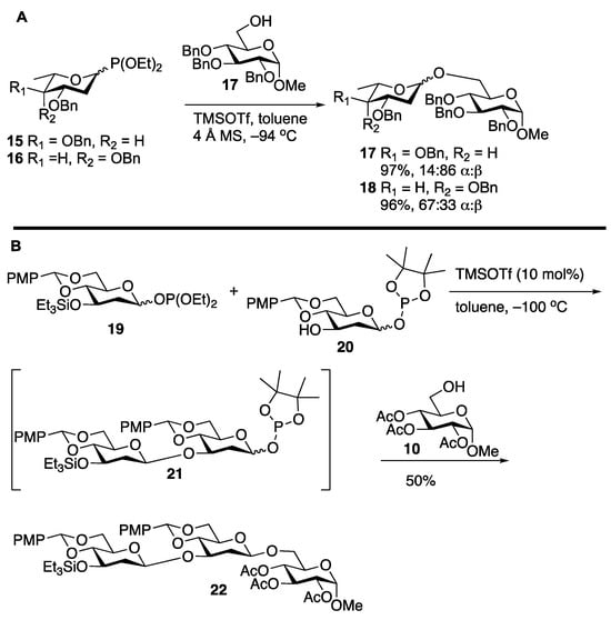 (A) Early direct synthesis of β-linked deoxy sugars using glycosyl phosphites; (B) applications of glycosyl phosphites to one-pot oligosaccharide synthesis.