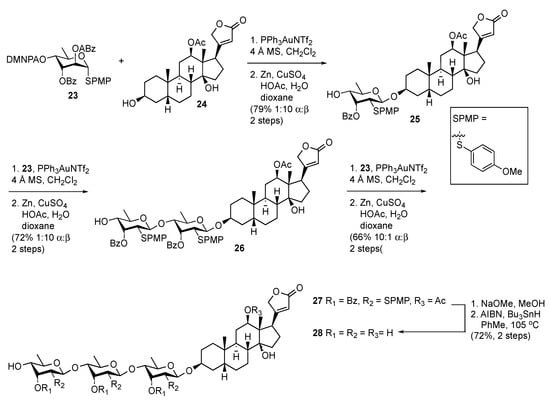 Recently reported directing group-based approaches most closely mirror classical-based approaches to deoxy sugar synthesis. These approaches can be broadly broken down into two distinct classes. The first approach relies on the use of thioglycosides possessing a leaving group at the 2-position that can be activated under catalytic conditions to generate an epi-sulfonium ion. Mechanistically, the activated leaving group is attacked by the sulfur of the thioglycoside to generate a transient species that is then attacked at the anomeric position to afford β-linked products. Two very recent examples both rely on gold catalysis for the activation of an alkynyl substituent on an axial-configured leaving group. The Liao and Sun groups demonstrated that the activation of p-methoxyphenyl manno- or rhamno-configured thioglycosides possessing an ortho-alkynylbenzoate (OAbz) group at the 2-position using AuNTf2 led to the formation of β-linked 2-deoxy-2-p-methoxyphenyl sugars with high levels of selectivity [31]. This chemistry was used for the construction of digitoxin using 23, possessing a C3 benzoate and C4 2,2,-dimethyl-2-ortho-nitrophenyl(acetyl) (DMNPA) protecting groups (Scheme 3) [32,33]. Selectivity in the reactions is high; however, it is hard to dissect how much of the observed selectivity arose through long-range participation of the C3 protecting group [34]. After three iterative rounds of glycosylation, global deprotection and Bu3SnH-mediated desulfurization afforded the digitoxin.