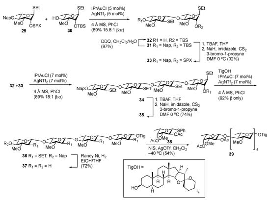 At the same time the Xu, Liu, and Li groups reported that a similar transformation could be affected on donors possessing a C2 S-propargyl xanthate (OSPX) leaving group using a combination of IPrAuCl and AgNTf2 [35]. In this case, phenyl thioglycoside donors were used, and the authors reported that the OABz leaving group was inferior, highlighting the need to consider both the anomeric and C2 leaving groups when utilizing such tactics. This chemistry was used for the construction of the pentasaccharide from the pregnane glycoside velutinoside A (Scheme 4). After the initial construction of disaccharide 31, the molecule was split into acceptor 32 and donor 33 through the removal of the Nap group and by converting the OTBS group to the OSPX group, respectively. Coupling of the fragments led to the formation of tetrasaccharide 34 with good yield and selectivity. This fragment could also be assembled through a one-pot [1 + 1 + 2] approach by taking advantage of the orthogonal reactivity of the OSPX and OABz groups to different gold catalysts. Following protecting group manipulations, the coupling of this tetrasaccharide to tigogenin (TigOH), as a model aglycone, desulfurization and Nap removal using Raney Ni, and coupling to fucose thioglycoside 38 afforded the desired target.