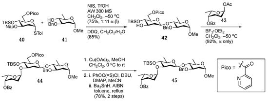 While these approaches do provide access to shorter oligosaccharides, they both also suffer from the limitations of the other indirect approaches described above. While the C2 leaving groups could be installed on readily available coupling partners (such as rhamnose), the reliance on an axial C2 conformation could make the synthesis of other types of glycans lengthy and tedious. An alternative approach relies on the use of directing groups to control selectivity in the reaction. In 2015, the Mong lab took inspiration from the Demchenko group and utilized the picoloyl (Pic) group to construct β-linked 2-deoxy glycosides through hydrogen bond-mediated delivery [38,39]. Through the attachment of this group to the C6 position, the authors were able to obtain high levels of selectivity, which they nicely illustrated through the synthesis of the landomycin E trisaccharide (Scheme 5). The need to place this group at the 6-position did represent one limitation to this approach as it required protecting group removal and subsequent Barton deoxygenation to afford the 2,6-dideoxy sugar-containing product [40].
