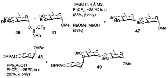 To address the issue of needing to carry out late-stage deoxygenation, the Li group developed the 2-(diphenylphosphinoyl)acetyl (DPPA) protecting group as an alternative approach for hydrogen bond-mediated delivery. Initially, this group was appended to the C6 position of the donor to afford disaccharides; however, this approach required deoxygenation conditions, similar to those described above [41]. Later the Li group found that this group could also be attached to the C3 position of olivose donors and the C4 position of rhodinose donors [42]. Using this new modification, the group was able to synthesize a protected analog of the trisaccharide fragment form landomycin E using N-(phenyl) trifluoroacetimidate and ABz donors (Scheme 6) [43,44]. While the DPPA group could be removed on disaccharide 47 using sodium methoxide, no attempt was made to remove it on the more sensitive trisaccharide 48. Later, the DPPA group was used by Yu and co-workers to synthesize a library of pregnane monosaccharides [45], although no attempt was made to utilize it in the construction of larger glycans.