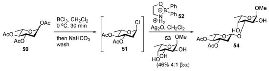 An early example of regio- and stereoselective synthesis of β-linked deoxy sugars was reported by the Taylor group in 2014 (Scheme 7) [47]. The group used borinate catalysts, which they demonstrated could be used to selectively acylate the equatorial alcohol of a 1,2-cis-diol [48], to regioselectively glycosylate diols and triols with deoxy sugar chloride donors. Owing to the instability of the 2-deoxy glycosyl chlorides, it was necessary to generate them in situ through the treatment of the corresponding glycosyl acetates using BCl3 [49]. Treating these species with borinate catalyst 52 in the presence of Ag2O and a nucleophile led to glycosylation with excellent regioselectivity. The reactions were moderately β-selective with 2-deoxy sugars being more selective than the corresponding 2,6-dideoxy sugars. Attempts to extend this chemistry to other leaving groups, such as 2-deoxy glycosyl mesylates, failed to provide selective reactions [50].