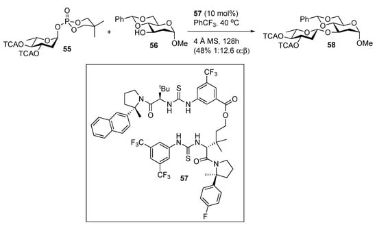 - Park, Y.; Harper, K.C.; Kuhl, N.; Kwan, E.E.; Liu, R.Y.; Jacobsen, E.N. Macrocyclic Bis-Thioureas Catalyze Stereospecific Glycosylation Reactions. Science 2017, 355, 162–166. [Google Scholar] [PubMed]