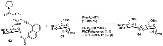 Transition metal catalysis has also been used by Zhang and co-workers, who demonstrated that alkyne-containing 1-naphthoate glycosides, such as 62, could be activated for glycosylation using catalytic gold (Scheme 10) [55]. The reaction proceeds through inversion of configuration, which the authors attribute to the ability of the amide to hydrogen bond to the incoming nucleophile. Although the major focus of the study was on the construction of 1,2-cis glycosides, the authors did show that benzoate-protected 2-deoxy sugars were competent donors in the reaction. The chemistry was not extended to the more reactive 2,6-dideoxy glycosides commonly found in natural products.