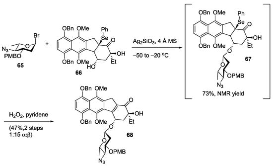 In reagent-controlled approaches, a promoter or additive is added to the reaction with the intent of generating a defined species in situ that can undergo stereoselective reactions. Several modulators have been developed; however, most of these exist for α-selective glycosylations [58,59,60]. When developing glycosylation reactions for β-linked deoxy sugars, the reactivity of both the sugar backbone and the leaving group must be considered. For example, in 2014, Herzon and coworkers studied the stability of several 2-deoxy and 2,6-dideoxy glycosyl bromides (generated in situ from the corresponding glycosyl acetate through treatment with TMSBr) [61]. These studies demonstrated that while armed olivose donors decomposed over 24 h in benzene-d6, donors possessing a disarming benzoate group were stable over this time. Furthermore, the authors also found that 2,4,6-trideoxy-4-azido glycosyl bromide could also serve as a competent glycosyl donor, a fact that this group took advantage of in their synthetic studies on lomaiviticin A (Scheme 11) [62,63]. To this end, the activation of donor 65 with silver silicate in the presence of 66 led to the formation of the glycosylated product 67 in 74% yield as a 15:1 (β:α) mixture of anomers, as measured by crude NMR. Because the initially formed glycosylation product was not sufficiently stable for purification, the crude material was subjected to peroxide-mediated conversion to enone 68, which could be isolated in 47% yield over the two steps.