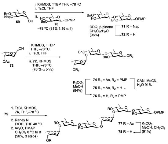 In an effort to improve the reproducibility and user friendliness of the reaction, the group later reported that p-toluenesulfonyl chloride (TsCl) could be used in the reaction [66]. This latter modification permitted the synthesis of several deoxy sugar oligosaccharides, including the trisaccharide from FD-594 and the natural product itself [67], the tetrasaccharide from kigamicin E, the pentasaccharide form saquayamycin Z [68], and the hexasaccharide form landomycin A [69]. The latter synthesis is illustrative of how the process can be applied to oligosaccharide synthesis (Scheme 12). In this process, the activation of donor 69 using TsCl and potassium hexamethyldisilazide (KHMDS), followed by treatment with the potassium alkoxide salt of 70 led to the formation of the disaccharide 71, which upon 2-naphthylmethyl (Nap) ether removal using 2,3-dichloro-4,5-dicyano-1,4-benzoquinone (DDQ) and β-pinene [70] provided disaccharide acceptor 72. This compound could be coupled with rhodinose donor 73 to afford trisaccharide 74 as a single α-anomer. The α-selectivity observed in this reaction is an indication that donor 73 is reacting through a different mechanism than olivose donor 69. Trisaccharide 74 could be then transformed into donor 75 and acceptor 76 through ceric ammonium nitrate (CAN)-mediated removal of the anomeric PMP ether [71] and methanolysis, respectively. The trisaccharide donor and acceptor could be united through another round of glycosylation; however, the perbenzylated product was not stable when exposed to silica. As a result, it was necessary to remove the arming benzyl ethers from the crude hexasaccharide, followed by global acetylation to provide hexasaccharide 77, which could then be isolated and deacetylated to give the target molecule.
