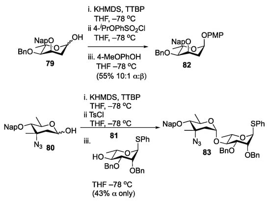 The α-selectivity observed with the rhodinose donor was an indication that TsCl is not a one-size-fits-all solution for controlling selectivity in glycosylation reactions with deoxy sugars. This was later shown in studies on digitoxose donor 79 and saccharosamine donor 80, both of which reacted to provide α-linked products upon activation with the electron-rich 4-isopropoxybenzenesulfonyl chloride or TsCl under otherwise identical conditions (Scheme 13) [72,73]. DFT studies on the latter donor indicated that the observed selectivity may be the result of the saccharosamine tosylate adopting a β-configuration in order to minimize unwanted steric and or electronic interactions with the axial C3 azide [74]. Further studies on C2-substituted sugars from the Bennett group indicated that for reactions to be β-selective, the reactivity of the sulfonate leaving group had to be matched to the reactivity of the glycosyl donor, as measured by the donors relative reactivity value (RRV) [75]. As such, with knowledge of the RRV of different deoxy sugars, it should be possible to build up a set of rules for predicting which sulfonate to use with a particular donor. However, these values have yet to be described for most deoxy sugars.