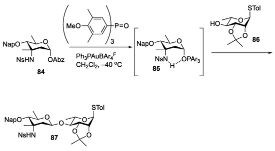 The presence of axial C-3 substituents can be taken advantage of for the production of β-linked deoxy sugars. An example of this was reported by Zeng, Wan, and coworkers, who demonstrated that while N-4-nitobenzenesulfonamide protected saccharosamine donors with an anomeric OABz group underwent α-selective glycosylations upon activation with PPh3AuNTf2 [76], the addition of tris(3,5-dimethyl-4-methoxyphenyl)phosphine oxide to the reaction resulted in β-specific reactions, including the saccharomicin disaccharide 86 [77] (Scheme 14). The authors posited that selectivity in the reaction is the result of hydrogen bonding between the C3 sulfonamide hydrogen and the oxygen of the phosphine oxide. This latter oxygen also interacts with the α-face of the anomeric carbon of the donor. A nucleophilic attack on the β-face of the molecule then leads to the formation of the product with high levels of selectivity.