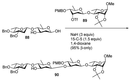 Anomeric alkylation was first reported by Schmidt and co-workers for the alkylation of C2-substituted hemiacetals with simple electrophiles and stereocontrolled trichloroacetimidate formation [78]. In 2004, Shair and co-workers described a report of the alkylation of deoxy sugar hemiacetals with primary and aromatic electrophiles that proceeded with excellent levels of β-selectivity [79]. The reaction worked with primary triflates; however, secondary triflates failed to undergo productive reactions. Later, in 2014, Zhu and coworkers demonstrated that the addition of 15-crown-5 (15-C-5) to the reaction did permit anomeric O-alkylation of secondary electrophiles; however, to avoid substrate decomposition, it was necessary to use C3-unprotected sugars, which were also converted to the corresponding bis sodium alkoxide [80]. Regioselectivity in the reaction is the result of repulsion between the lone pairs on the β-linked anomeric alkoxide and the endocyclic pyran ring oxygen, which enhances the reactivity of the anomeric position. Through this methodology, the authors were able to synthesize several deoxy sugar oligosaccharides (Scheme 15), including the trisaccharide from landomycin E [81]. Interestingly, selectivity in the reaction is dependent on the configuration of the C3 substituent. When this substituent is axial, α-linked products are formed exclusively, a factor which the authors attribute to the chelation of the sodium cation between the C1 and C3 alkoxides (Scheme 16) [82].