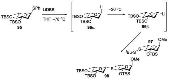 In 2013, the Zhu lab reported an umpolung approach to S-glycoside synthesis based on reductive lithiation of S-phenyl glycosides followed by trapping the resulting anomeric anion with tert-butydisulfide-containing sugars as the electrophile [83]. After treatment with lithium 4,4′-di-tert-butylbiphenyl (LiDBB), the reaction proceeds through the initial formation of an α-lithio species (96α), which equilibrates to the corresponding β-linked glycosyl lithium (96β) upon warming to −20 °C (Scheme 17). This species can then effectively react at the more sterically accessible position of the disulfide electrophile, leading to the S-linked product. The group demonstrated the utility of this chemistry through the construction of an S-linked analog of the landomycin A hexasaccharide through a [2 + 2 + 2] process [84].
