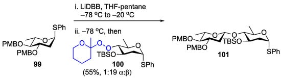 Later, Herzon and coworkers extended this chemistry to O-glycoside synthesis using (2-methyl)-tetrahydropyranyl (MTHP) peroxy acetals as the electrophilic component of the reaction [85]. Similar to the work by Zhu, treating olivose and 2-deoxy glucose phenyl thioglycosides with LiDBB resulted in the initial formation of an α-configured glycosyl lithium species, which, upon warming to −20 °C, equilibrated to the β-configured lithium. Cooling the solution back to −78 °C, followed by the addition of the MTHP peroxy acetal leads to the formation of β-linked products with excellent selectivity (Scheme 18). Since the reaction involves pre-activation of the nucleophile, thioglycosides are competent electrophiles in the reaction, permitting one-pot synthetic approaches.