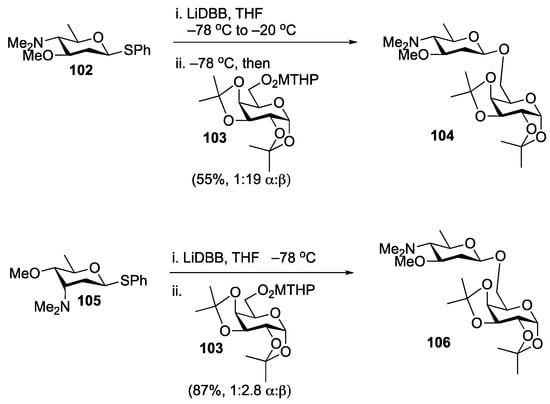 Subsequent studies of the scope of the reaction demonstrated that dialkyl amines and free hydroxyls were tolerated by the reaction [86,87], although these substrates were more sensitive to substitution. For example, pyrrolosamine derivative 102 reacted with acceptor 103 to provide the disaccharide with excellent selectivity (Scheme 19). On the other hand, the corresponding megalosamine derivative 105 reacted with the same electrophile, without warming to equilibrate to the configuration of the lithium ion, providing 106 with excellent yield and modest β-selectivity. The authors attribute the change in selectivity to the rapid equilibration between the α- and β-radicals formed in 105 upon initial C-S bond cleavage before a second electron is transferred to generate the anomeric anion.