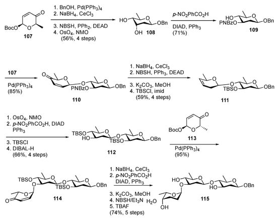 The O’Doherty group’s synthesis of the trisaccharide of landomycin E is illustrative (Scheme 20). Pd-mediated glycosylation of 107, followed by Luche reduction [91], Myers allylic transposition [92], and dihydroxylation afforded digitoxose 108. Selective Mitsunobu inversion of the axial C3 alcohol then afforded acceptor 109. A second round of glycosylation afforded 110, which was transformed into 111 through a similar sequence. The protecting group swap was carried out in anticipation for a second round of dihydroxylation followed by Mitsunobu inversion and protecting group manipulations to afford disaccharide 112. A final round of glycosylation using 113 afforded trisaccharide 114, which could be converted to 115 through standard manipulations.