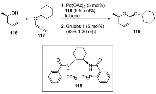 An alternative approach to de novo synthesis based exclusively on catalyst control was reported by Rhee and co-workers in 2014 [93]. The synthesis involves a two-step process beginning with Pd-mediated coupling between an alcohol and an alkoxy allene (Scheme 21). The resulting ether is then cyclized through ring-closing metathesis. The stereochemistry in the reaction is set by the chirality of the alcohol and the selection of the ligand on the palladium catalysis. The (R,R) catalyst affords β-linked products with (R)-alcohol 116, while the (S,S) catalyst affords the α-linked product. Notably, the use of the enantiomerically pure alcohol affords access to enantiomeric sugars, following post-glycosylation modification.