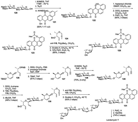 The Rhee group has used this strategy for the construction of several β-linked deoxy sugar-containing oligosaccharides, including langkocycline oligosaccharides [94], the digitoxin trisaccharide [95], the saccharomicin–rhamnose linkage from saccharomicin [96], and landomycin Y [97]. The synthesis of landomycin Y is illustrated in Scheme 22. Coupling of disaccharide 120 to aglycone 122 under Bennett’s sulfonate-mediated conditions afforded 122 with high β-selectivity. Protecting group manipulations afforded 123, which was coupled to alkoxy allene 124 via Pd catalysis. The product was subjected to olefin metathesis and hydrogenolysis to afford the trisaccharide landomycin P precursor 125. To complete the synthesis of landomycin Y, 126 (synthesized through Li’s β-selective Ferrier rearrangement [98]) was converted to propargyl alcohol 127. Another round of sulfonate glycosylation afforded 129, which upon subjugation to protecting group manipulations and another round of Pd-mediated glycosylation furnished 130. This molecule could be coupled to 123 in a subsequent Pd-mediated glycosylation followed by olefin metathesis to afford landomycin Y precursor 131. Finally, hydrogenolysis of the benzyl ether and olefins, followed by methanolysis of the ester provided the natural product.