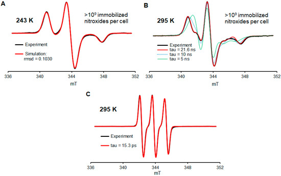While at 243 K, all nitroxide radicals are immobilized in the frozen aqueous buffer medium (Figure 2A, simulation). Another spectrum, obtained in a fluid medium at 295 K from the same sample but diluted with extra volume of PBS, indicated that 90+% of nitroxide radicals are well immobilized, with a rotational correlation time of τcor ≥ 20 ns (Figure 2B, Table S1, Supplementary Materials). For comparison, the EPR spectra of nitroxide 2a in the cell medium at 295 K indicate τcor in the picosecond range (Figure 2C), as expected for a small molecule nitroxide radical [6,47]. We note that the degree of immobilization of nitroxide radical 2a is comparable to that obtained by biorthogonal labeling of the MBP (211/295 mutant) protein with a derivative of 4 in live HEK293T cells [21]. However, this τcor ≥ 20 ns is much longer than τcor = 0.115 ns for nitroxides strongly complexed inside cucurbit [7], uril [47], or spirocyclohexyl pyrrolidine nitroxides immobilized by conjugation to polymers used for MRI such as τcor = 1.5 ns in dendrimer ORCA [6] or τcor ≈ 10 ns in the brush-arm star polymer BASP-ORCA [11].