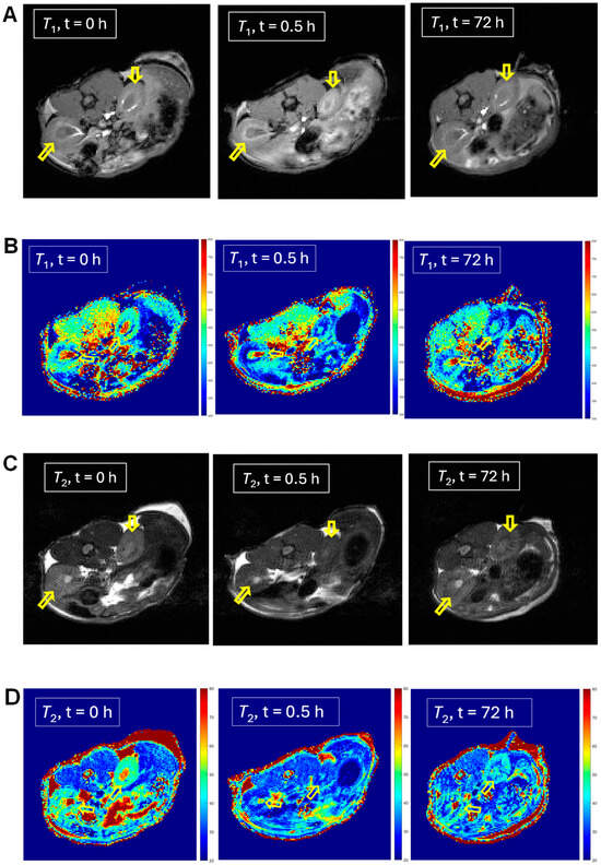 MRI T1-weighted images (A), T1 maps (B), T2-weighted images (C), and T2 maps (D) of kidneys in a selected mouse injected with mORCA 2 at 0 h (pre-injection), 0.5 h (post-injection), and 72 h (final image). Small, yellow arrows point to kidneys, and for maps, color-bar ranges are 300–800 ms (T1) and 20–80 ms (T2), from blue to red. A summary of T1 (E) and T2 (F) relative vs. pre-injection at the 0 h decrease for post-injection at 0.5 h and the final image at 72 h. For more details, see Table 1 and Supplementary Materials (Section S3).