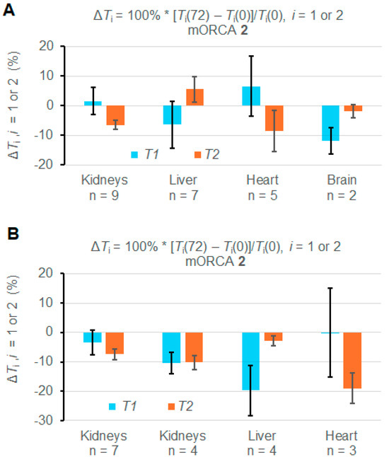 Summary of relative ΔT1 and ΔT2 (%) for T1 and T2 maps at 72 h vs. 0 h (pre-injection) for mice injected with mORCA 2. (A) Maps are acquired for all studied animals. (B) Maps are for selected animals (n = 3–7). For more details, see Table 1 and Supplementary Materials (Section S3).