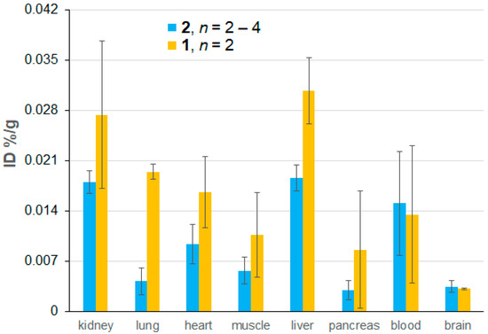 Biodistribution of nitroxide radicals as a percentage of the injected dose (%ID) based on ex vivo EPR spectroscopic quantification, which is carried out 72 h after the initial injection and 24 h after the last injection of mORCAs 1 (orange bars) or 2 (blue bars). Each animal received three 6 mg doses of mORCAs spaced by 24 h. The reported values represent the mean ± SEM, with n = 2 for 1 and n = 4 for 2, except for the muscle and brain for 2 where n = 3 and n = 2, respectively. For more details, see Supplementary Materials (Section S4), including Table S3.