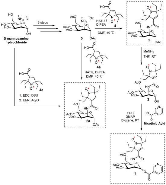 The synthesis of 2 and 2a, as well as nicotinate-substituted agent 1, is initiated using commercially available D-mannosamine hydrochloride. The initial three-step synthesis of tetra-O-acetyl D-mannosamine oxalate 5 is performed according to the previously published protocol [43]. Compounds 2 and 2a are synthesized from pyrroline and pyrrolidine nitroxides 4 and 4a [15,16], respectively, using the HATU amidation reaction [44] with tetra-O-acetyl D-mannosamine oxalate 5. (Alternatively, 2a is prepared via a one-pot reaction directly from D-mannosamine hydrochloride and 4a.) Selective hydrolysis of the O-acetyl group at anomeric carbon (C1) in 2 is performed using methylamine (MeNH2) in THF [45] to yield compound 3. Finally, the hydroxyl (-OH) group in hemiacetal 3 reacted with nicotinic acid via an EDC-mediated esterification reaction to produce two diastereomers (A and B) of mannosamine nicotinate 1 [28] (Scheme 1).