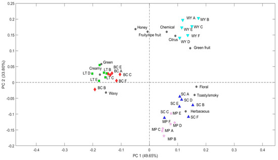 Biplot (PC1 vs. PC2) of the PCA performed on auto-scaled odorant series’ measurement. The odorant data were used as predictor variables, while the wines produced with the different yeast strains (WY: wild type; SC: Saccharomyces cerevisiae; MP: Metschnikowia pulcherrima; LT: Lachancea thermotolerans; and BC: biocapsules of L. thermotolerans) were used as response variables.
