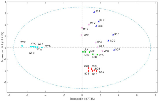 Score plot (LV1 vs. LV2) of the PLS-DA performed on auto-scaled E-nose measurement. The responses of the QMBs were used as predictor variables while the wines produced with the different yeast strains (WY: obtained by spontaneous fermentation; SC: using Saccharomyces cerevisiae active dry yeast; MP: using Metschnikowia pulcherrima active dry yeast; LT: using Lachancea thermotolerans yeast in free format; and BC: with L. thermotolerans immobilized) were used as response variables.