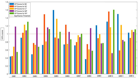 Variables of importance in projection (VIPs) generated by each QMB with an efficacy threshold base equal to one. The plot shows the effect of the variables [loadings and QMBs] on the pattern recognition discrimination of the partial least squares discriminant analysis.