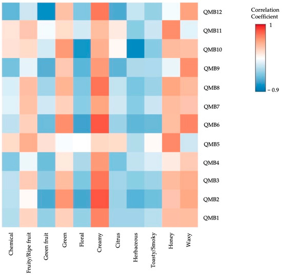 In contrast, the green series characterizing LT and BC wines was positively correlated with all sensors except QMB 5. Conversely, series such as “floral”, “citrus”, “herbaceous”, and “toasty/smoky” showed negative correlations with all sensors. On the other hand, series such as “creamy”, “honey”, and “waxy” were positively correlated with most QMB sensors, with only a few exceptions. As other authors have noted, electronic noses have a greater ability to detect and correlate wine compounds without being affected by human variability. In contrast, sensory analysis, although linked to real aroma perception, is influenced by natural differences between individuals [45].