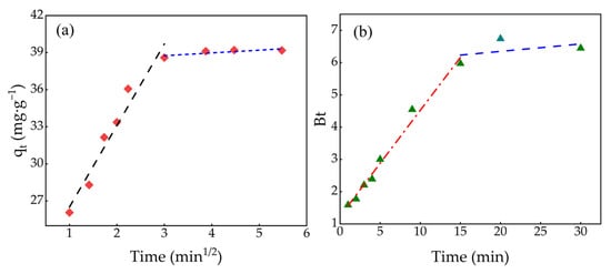 | Intraparticle diffusion | Ki,1 (mg g−1 min1/2) | 0.943 |