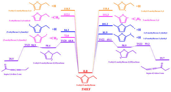 Through H-transfer reaction, 5-MEF may be converted to 2-ethyl-5-methylfuran-3(2H) carbene and 5-ethyl-2-methylfuran-3(2H) carbene with the energy barriers 68.8 kcal·mol−1 (TS20) and 69.1 kcal·mol−1 (TS22), respectively. Subsequently, 2-ethyl-5-methylfuran-3(2H) carbene and 5-ethyl-2-methylfuran-3(2H) carbene undergo decomposition reactions to form hepta-3,4-dien-2-one and hepta-4,5-dien-3-one with energy barriers of 58.9 kcal·mol−1 (TS21) and 59.2 kcal·mol−1 (TS23), respectively. The energy barrier of the intramolecular H-transfer decomposition reaction of 5-MEF is more dominant than that of the unimolecular dissociation reaction, which dominates the beginning of the fuel pyrolysis reaction.
