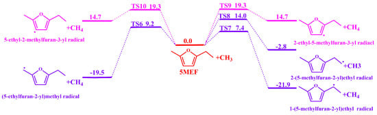The H-abstraction reaction of methyl groups with 5-MEF was also considered in the current work. There are two H-atom abstraction sites on the branched ethyl chain of 5-MEF that react with methyl to form 2-(5-methylfuran-2-yl)ethyl radical + CH4 and 1-(5-methylfuran-2-yl)ethyl radical + CH4 with energy barriers of 12.9 kcal·mol−1 (TS8) and 16.2 kcal·mol−1 (TS7), respectively. The H atom on the CH3 in the branched chain of 5-MEF undergoes a H-abstraction reaction with the CH3 to form (5-ethylfuran-2-yl)methyl radical + CH4 with an energy barrier of 9.2 kcal·mol−1. The H atoms on C (3) and C (4) of the 5-MEF ring undergo H-abstraction reactions with methyl groups to form 2-ethyl-5-methylfuran-3-yl radical + CH4 and 5-ethyl-2-methylfuran-3-yl radical + CH4 with energy barriers of 19.3 kcal·mol−1 (TS9) and 19.3 kcal·mol−1 (TS10), respectively. It is interesting to note that in the current calculations the difference between the energy barriers and the relative energies of the products of the H-abstraction reactions of CH3 with H atoms on the 5-MEF ring is very small.