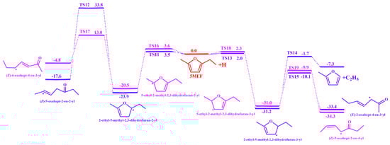 The potential energy surface for the addition of H atoms to 5−MEF was calculated at the CBS-QB3 level. The unit is in kcal·mol−1. Zero-point energies are included.