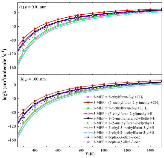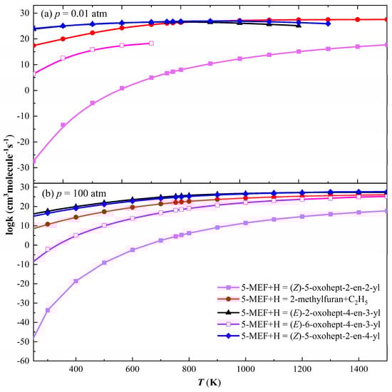 The rate constants for the addition reaction of 5-MEF with H at temperatures from 250 to 1500 K. (a) p = 0.01 atm; (b) p = 100 atm.