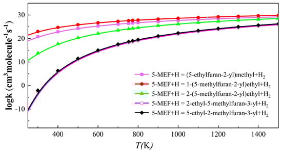 Figure 7 illustrates the rate constant for the H-abstraction reaction of 5-MEF with H atoms. The results show that the C(6) site has the largest rate constant for H-abstraction, followed by the reaction channel at the C(8) site. In contrast, the rate constants of H-abstraction reactions at the C(3) and C(4) sites on the furan ring were smaller and significantly lower than those of the reaction channels at the branched positions, and thus they were not the major reaction channels. In addition, the difference in the H-abstraction reaction rate constants between the C(6) and C(7) sites was large at temperatures lower than 1100 K, but the gap between the rate constants of the two reaction channels gradually narrowed as the temperature increased (see Supplementary Materials).