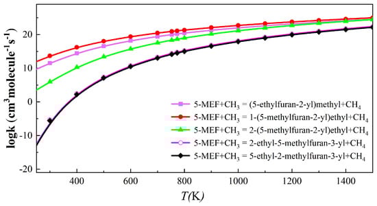 Figure 8 shows the rate constant for the abstraction reaction of 5-MEF with CH3. Similar to the H atom abstraction reaction, the C(6) site has the largest H-abstraction rate constant, followed closely by the reaction channel at the C(8) site. In contrast, the H-abstraction reaction rate constants for the C(3) and C(4) sites on the furan ring were smaller and significantly lower than those of the reaction channels at the branched positions, and thus they were not the major reaction pathways. Further, the difference in rate constants between the C(6) and C(7) sites was large at temperatures lower than 1100 K, but the gap between the rate constants of these two reaction channels gradually narrowed as the temperature increased.